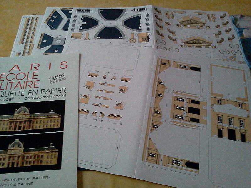 L'École militaire de Paris. Bâtiment de l'architecte Gabriel (1752). Modèle publié en 1988. Cahier de 12 pages A4 21x29,7cm. 8 pages de planches. Echelle 1/250ème. 168 pièces. Taille du modèle construit : 40cm. Modèle bicolore: ton pierre uni et ardoise et zinc pour les toitures: modèle d'architecture de belle allure.