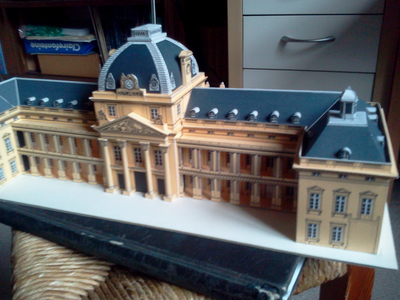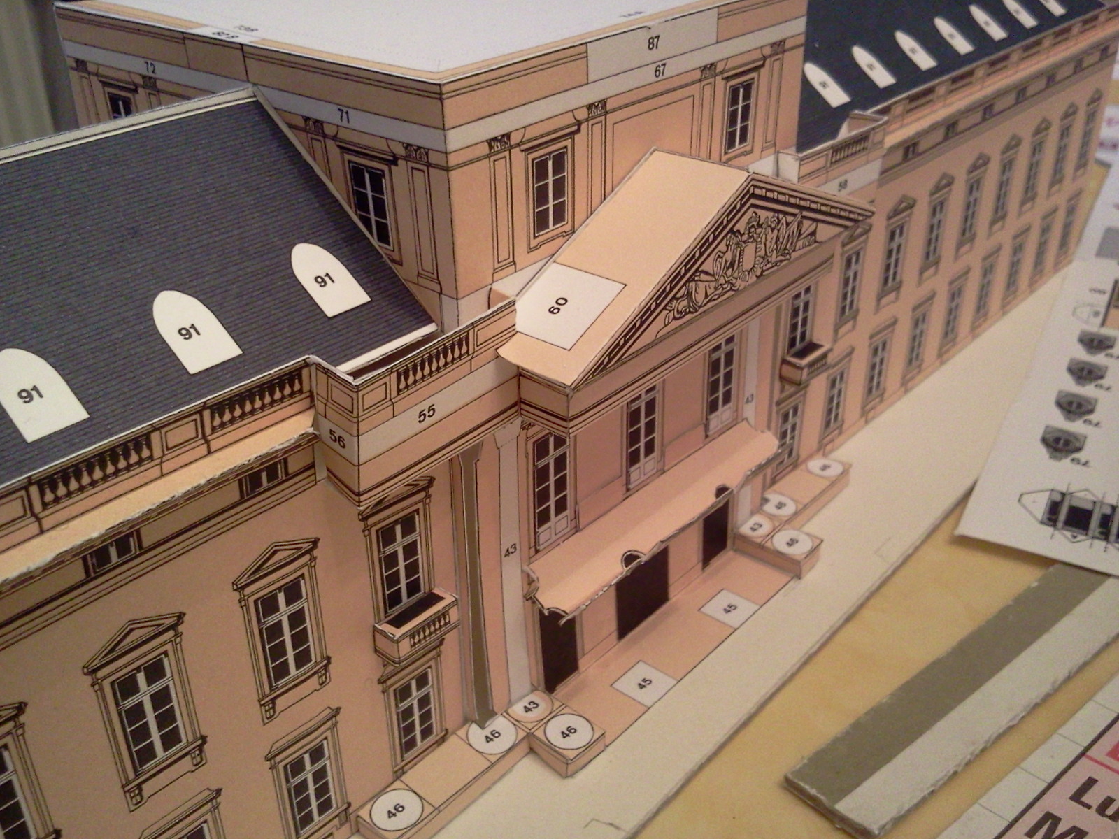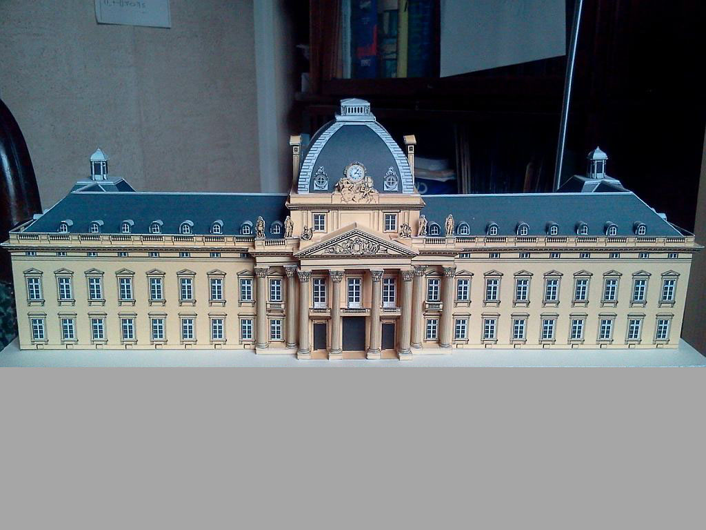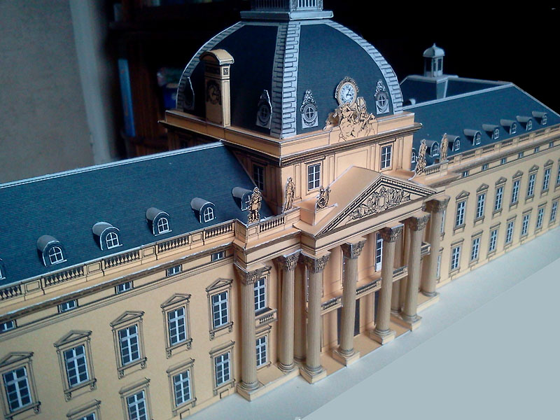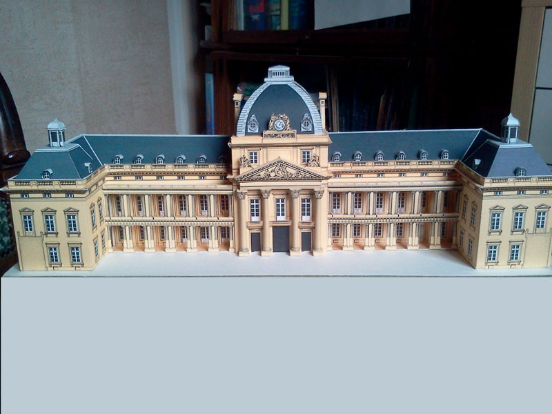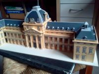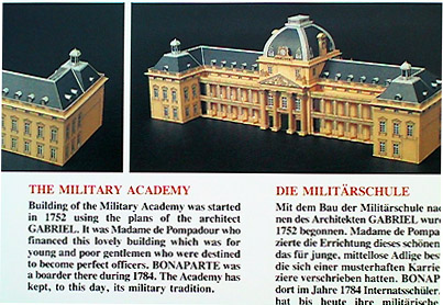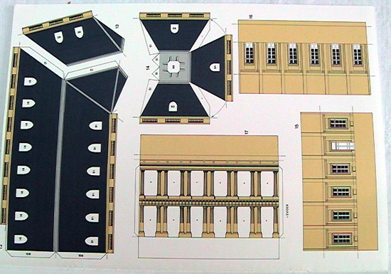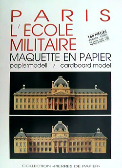 The Military Academy in Paris. Typical building from the french architect Gabriel (1752). Cardmodel published in 1988. 12p. book A4 with 168 parts on 8 pages. Scale 1/250. Length of he model: 40cm. Assembly instructions by drawings. Architectural model with only one uniform stone color but very nice looking. |