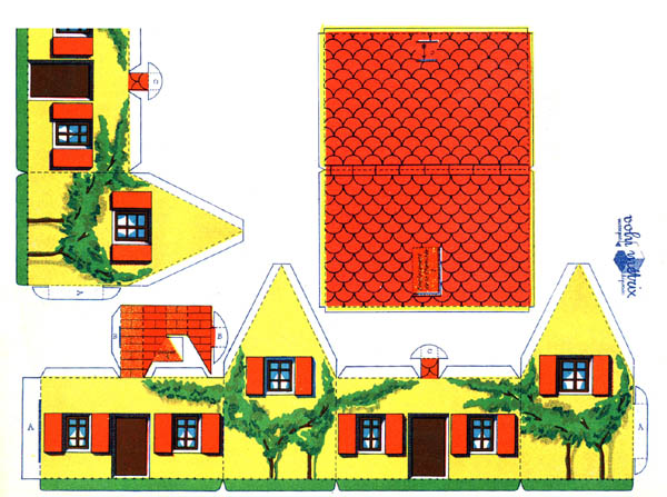 Simple toys models. Assembly with tabs without glue: so cutting and folding is more difficult (see the chimney for example on the sheet above.