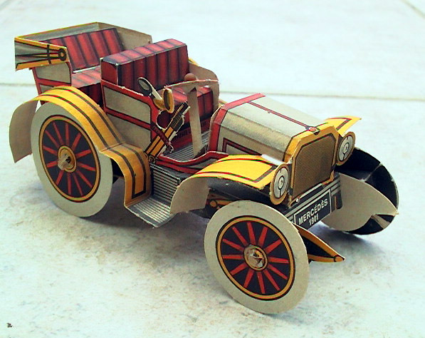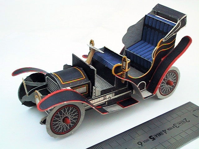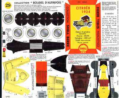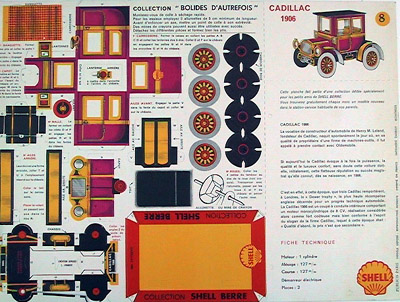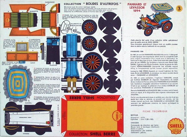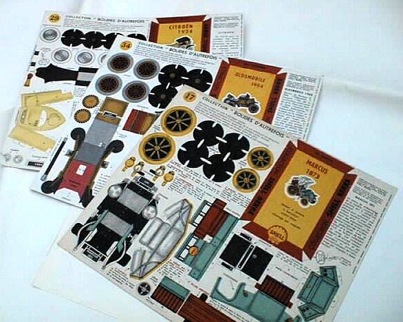 Planches 23x28 cm prédécoupées : à gauche la planche n°8 dans le format initial 3 volets plus grand. Éditées par Publicis, ces planches étaient distribuées dans les stations services SHELL en 1959-1960. Échelle 1/32 environ variable selon les modèles. La collection en comportait plus d'une trentaine des débuts de l'automobile jusqu'en 1930.