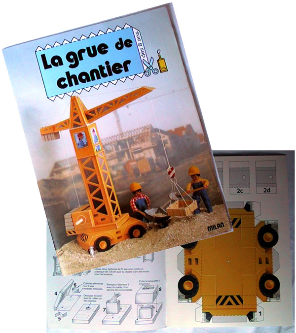 Adaptation française d'une édition allemande Ravensburger de 1987. Publié en 1989 c'est un découpage "jouet" à parties mobiles mais nécessitant des adjonctions diverses (fil de fer, bobines de fil, etc...). Dans la même collection ont été publiées : le camion des pompiers avec grande échelle et les boîtes-cadeaux.