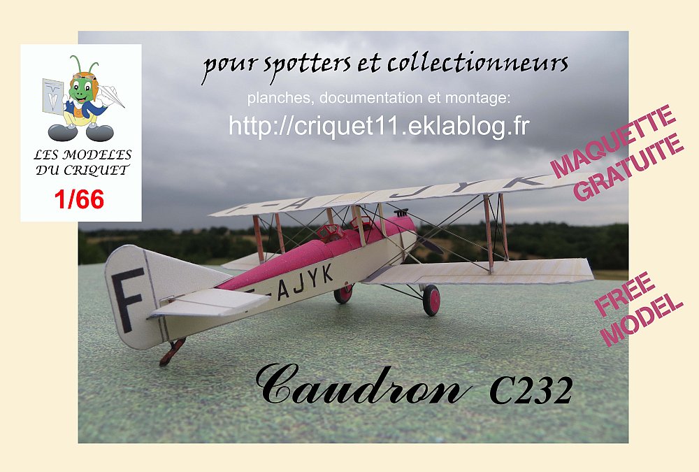 Philippe vous propose le Caudron C232 : l'historique et les détails sont sur son blog Criquet. Bien sûr, étant donné la taille et le détaillage de cet avion, c'est un modèle pour modéliste expérimenté.