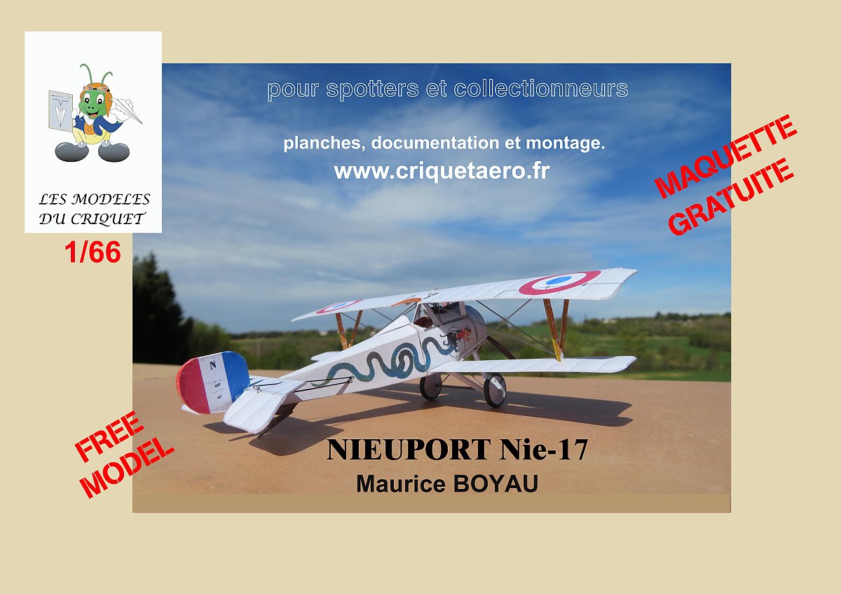 Pour son "hangar", Philippe Rennesson vous propose le modèle du Nieuport17 de Maurice Boyau au 1/66ème et toujours aussi détaillé. Toutes les informations sont sur son blog Criquetaero. Attention, il y a une impression à faire recto/verso !