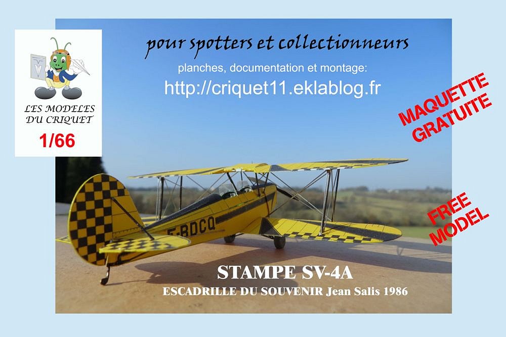 Philippe Rennesson vous propose le célèbre Stampe SV4 à l'échelle 1/66 ème. La mise en couleurs est la même que celle du modèle au 1/33ème est l'oeuvre d'Alban Dury. Tous les détails sont sur le blog de Philippe Criquet. Bien sûr, étant donné la taille et le détaillage de cet avion, c'est un modèle pour modéliste expérimenté.