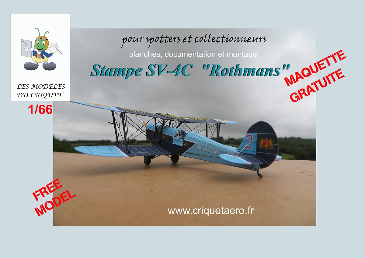 This Philippe's is the model of the famous Rothmans patrol Stampe SV4C in scale 1:66. See Philippe's blog Criquetaero for details. Warning: model only for expert cardmodeler!
