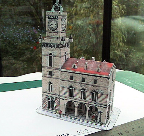 Construction à l'échelle 1/2 de la planche originale. Le modèle ainsi obtenu est assez élégant mais simplifié par rapport au bâtiment réel. La galerie sous colonnade est représentée. Les détails architecturaux de la tour sont omis. L'échelle résultante doit être 1/350ème.