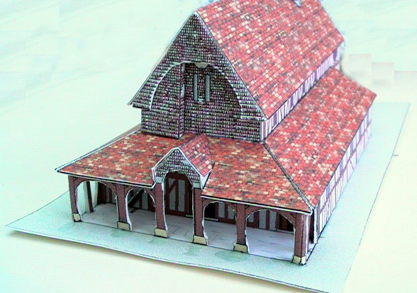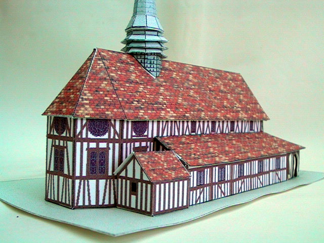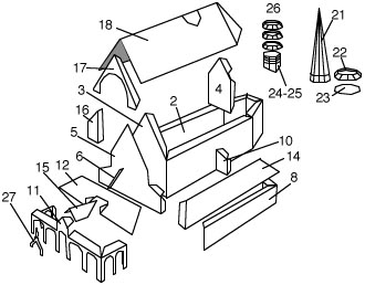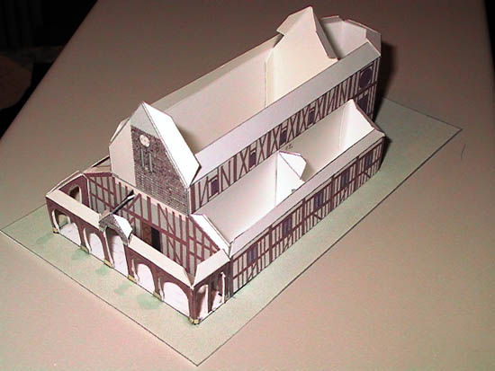 Le montage se fait à peu près dans l'ordre des numéros de pièces. Comme toujours marquer les plis avant de découper les pièces. Les numéros soulignés correspondent aux emplacements de collage. 1 - Commencer par le collage des parois de la nef (pièces 2 et 3) que l'on colle sur la base 1. La façade 5 est collée sur la pièce 3 en vérifiant bien l'alignement. Mettre en place le renfort interne 4 comme indiqué sur la base 1. Plier l'échelle 6 et la coller contre la façade le long du trait marqué sur 5. 2 - Former les allées latérales 7 et 8 et les mettre en place (collages sur les pièces 2 et 5 et la base 1). Mettre en place les renforts internes 9 et 10. 3 - Construire le porche 11: découper son contour et le doubler en repliant la partie colorée préalablement incisée à hauteur des coins. Une fois sec, découper soigneusement les arcades. Mettre en place en vérifiant les alignements et la verticalité des poteaux. 4 - Mettre en place les toits latéraux 13 et 14, les coller ainsi que le toit du porche 12. Coller la cage d'accès 16 au toit contre la pièce 5 et coller le toit de l'entrée 15 sur les pattes centrales de 11 et sur le toit 12. Doubler la pièce (statue) 27 et la mettre en place sur la tranche du toit 15 du porche. 5 - Fermer les 3 pans du chevet du toit 18 et coller la pièce 17 au ras du bord du toit 18. Le mettre en place et coller en vérifiant que la pièce 17 est bien appliquée sur la pièce 16 et la régularité des pentes du toit de l'abside. 6 - Monter la sacristie 19 avec son toit 20. La mettre à son emplacement sur la base 1. 7 - Monter le clocher octogonal en collant le