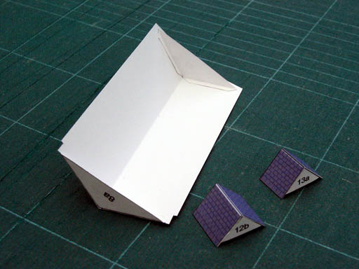 Cut out and roll roofs 15,16 and 17. Glue and place checking